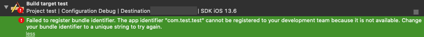 bundle identifier의 등록을 실패했고, 앱의 identifier "~"를 사용할 수 없어 당신의 개발팀에 등록할 수 없으므로 , 당신의 bundle identifier를 고유한 문자열로 변경하고 다시 시도해보세요.